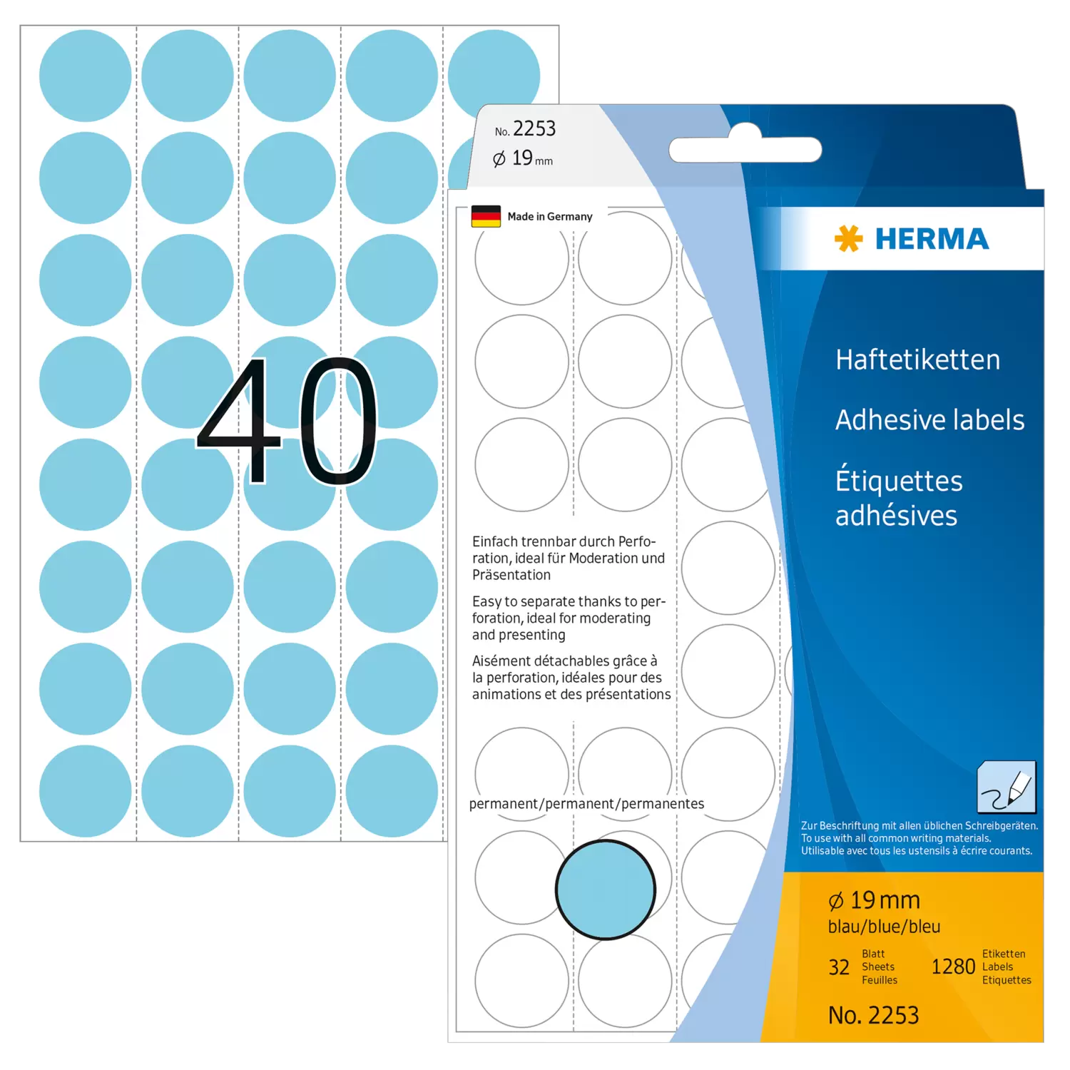 Étiquettes/pastilles de couleur Ø 19 mm, rondes, bleues, permanentes, inscription manuelle