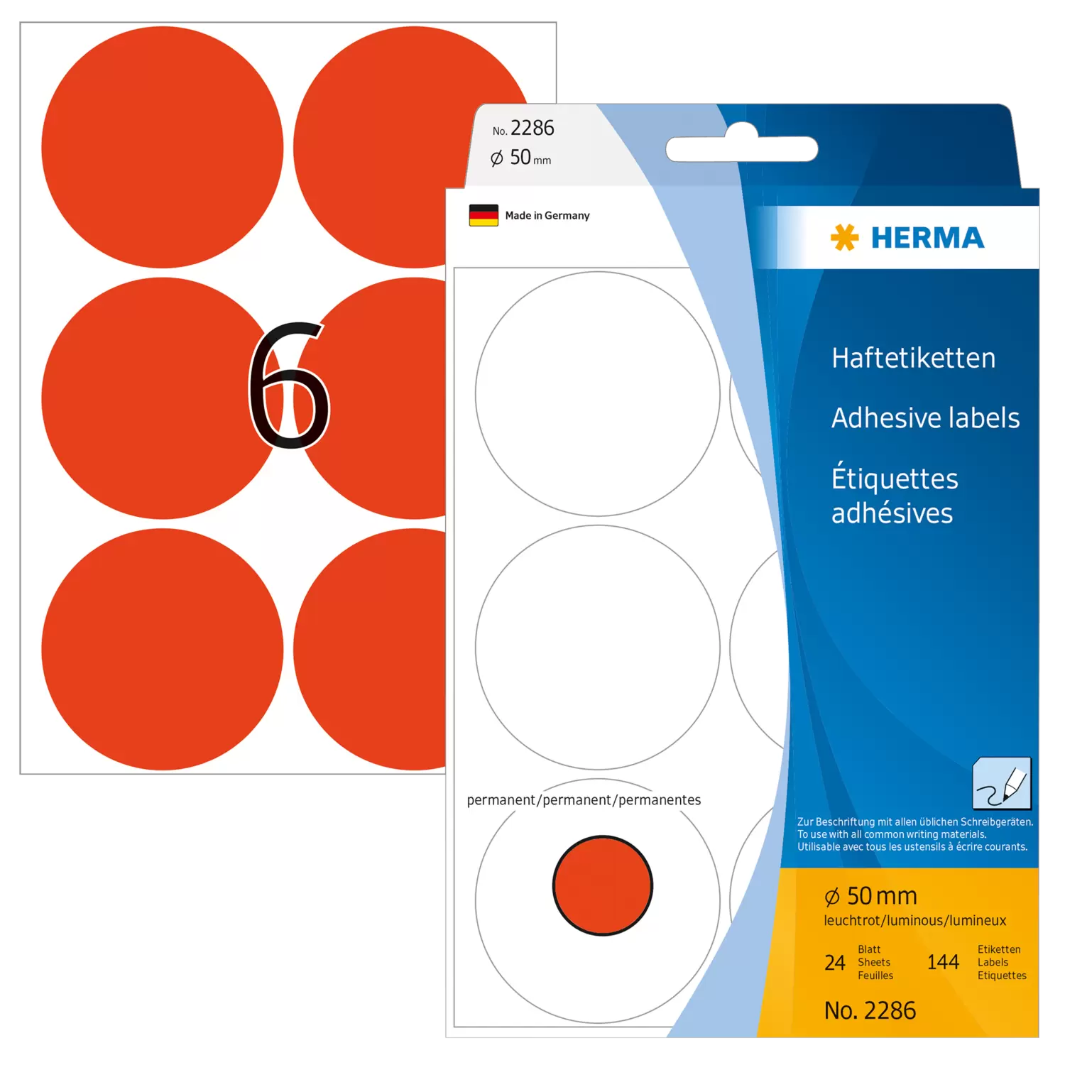 Étiquettes/pastilles de couleur Ø 50 mm, rondes, rouges fluo, permanentes, inscription manuelle