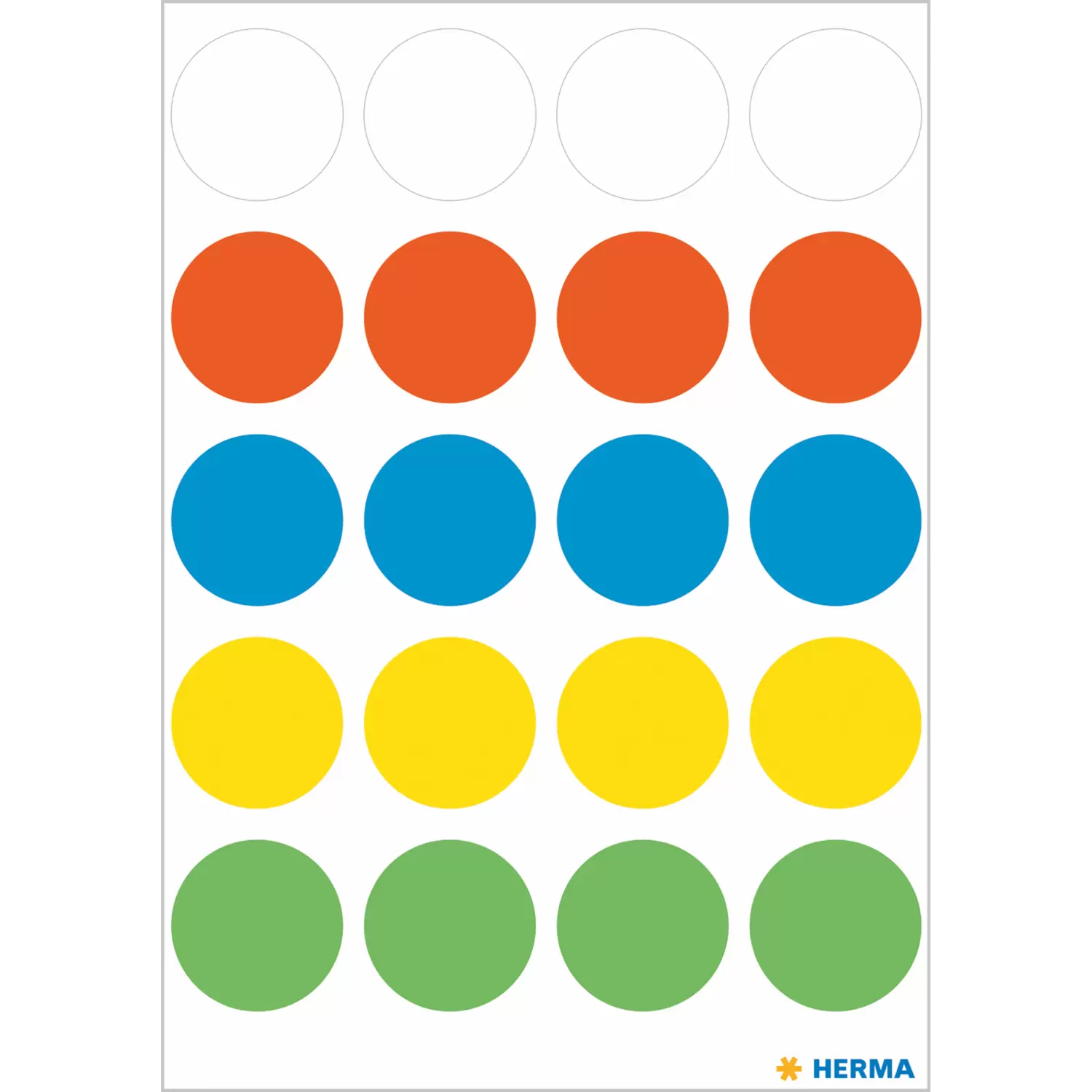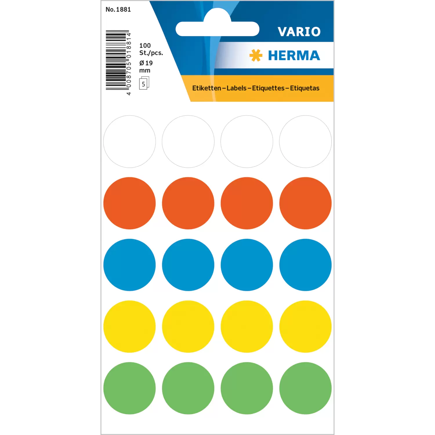 Étiquettes universelles, Ø 19 mm, rondes, couleurs assorties, permanentes, inscription manuelle