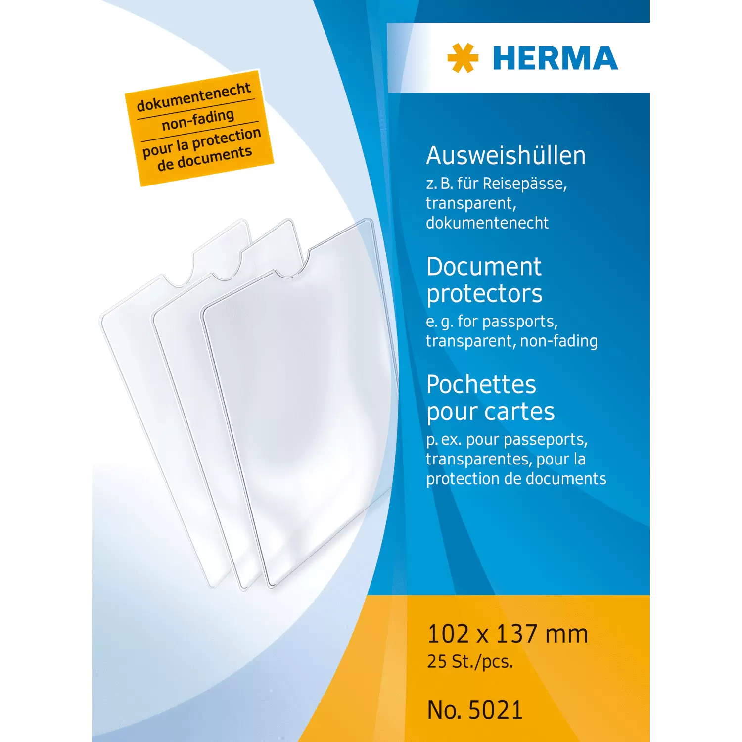 Les documents, les pièces d'identité ainsi que les cartes bancaires, de crédit et autres cartes importantes doivent être bien protégés et conservés en toute sécurité. La pochette à insérer de HERMA en film polypropylène transparent est idéale pour les passeports et autres documents au format 102 x 137 mm. La pochette est extrêmement résistante et robuste, indélébile, indéchirable, inodore et protège contre l'humidité, la saleté et l'usure, même en déplacement dans le porte-monnaie, le sac à main ou la poche de pantalon. C'est la qualité HERMA Made in Germany.