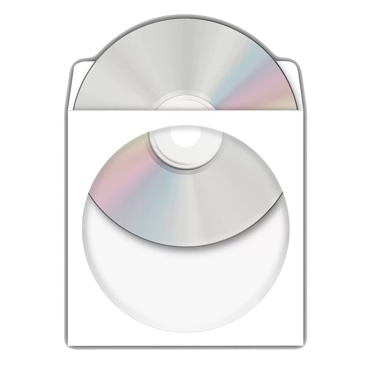 Pochettes de classement de CD en papier, avec fenêtre transparente. Une pastille autocollante au dos permet de les fixer dans des catalogues, prospectus, etc.