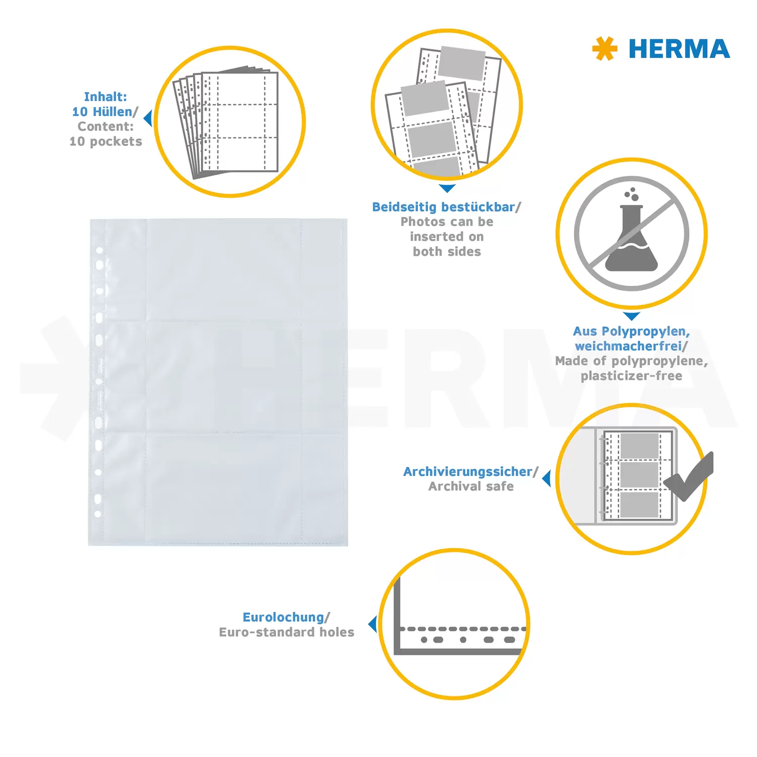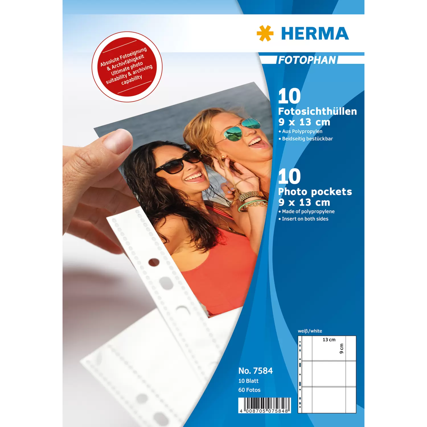 Les pochettes transparentes pour photos Fotophan de HERMA sont des aides pratiques pour le classement et l'archivage de photos, images, cartes postales, billets d'entrée et bien plus encore. Il suffit de les glisser dans les pochettes transparentes et tout est déjà bien rangé - sans complication et sans collage ! Les pochettes photo sont en polypropylène blanc robuste, avec des pochettes transparentes soudées des deux côtés pour les photos jusqu'au format 9 x 13 cm à l'horizontale. Chaque pochette peut ainsi contenir 6 photos en toute sécurité. Les pochettes sont absolument exemptes de plastifiant et résistantes à l'archivage, sans influence chimique sur les photos. Chaque paquet contient 10 pochettes pouvant contenir 60 photos. Grâce à la perforation européenne pratique, elles peuvent être insérées dans tous les classeurs, albums et classeurs à anneaux courants pour les formats A4. Les Fotobooks de HERMA, disponibles en 5 superbes couleurs, sont idéaux. Une protection parfaite, sans saleté, ni pliures, ni traces de doigt.