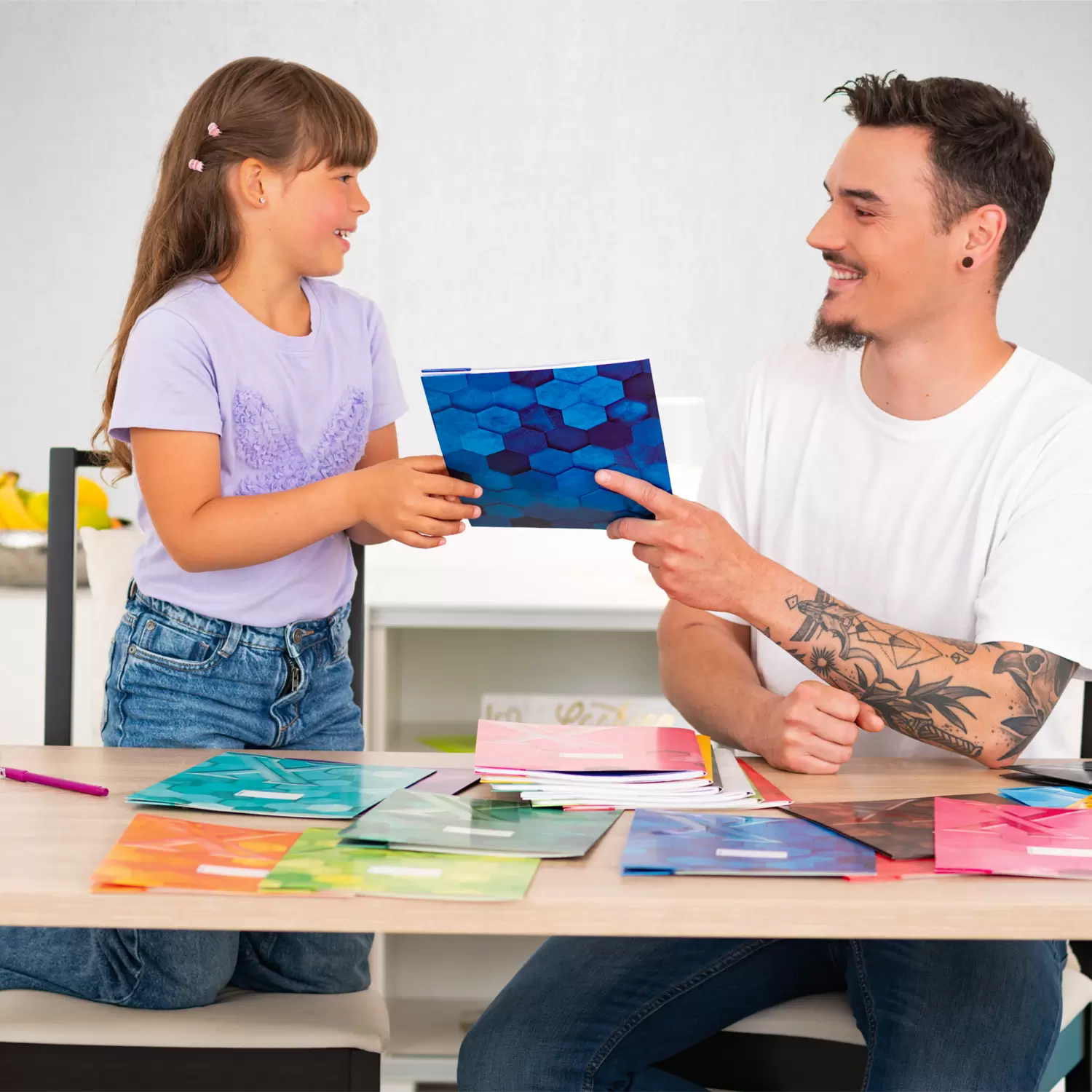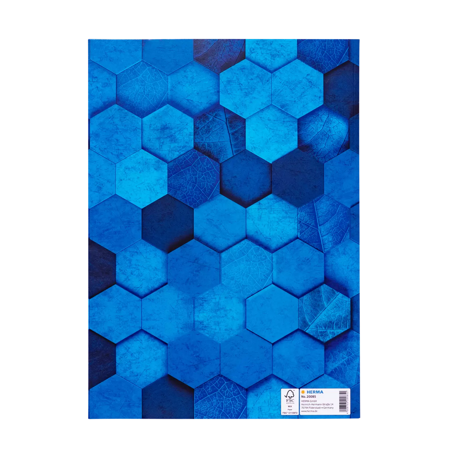 Le protège-cahier X de HERMA, en carton robuste, est unique et mystérieux. Le X lumineux et raffiné sur la face avant représente-t-il la variable mathématique, un code secret, l'élément créatif ou l'inconnue du contenu du cahier qui sera protégé ? Le protège-cahier de la série X n'est pas une simple jaquette, mais une porte vers un monde d'aventures et de mystères, mystique et varié. Ce protège-cahier bleu foncé X est au format A4 et est décoré d'hexagones artistiques, ceux-ci sont remplis de fines structures de feuilles qui créent une structure organique fascinante. La vue de ce design cool avec le X lumineux et raffiné libère la créativité et permet de coucher les idées sur le papier. À l'école, pour étudier ou pendant les loisirs, ce protège-cahier est le compagnon idéal pour tous ceux qui recherchent l'originalité : la nouvelle série X.