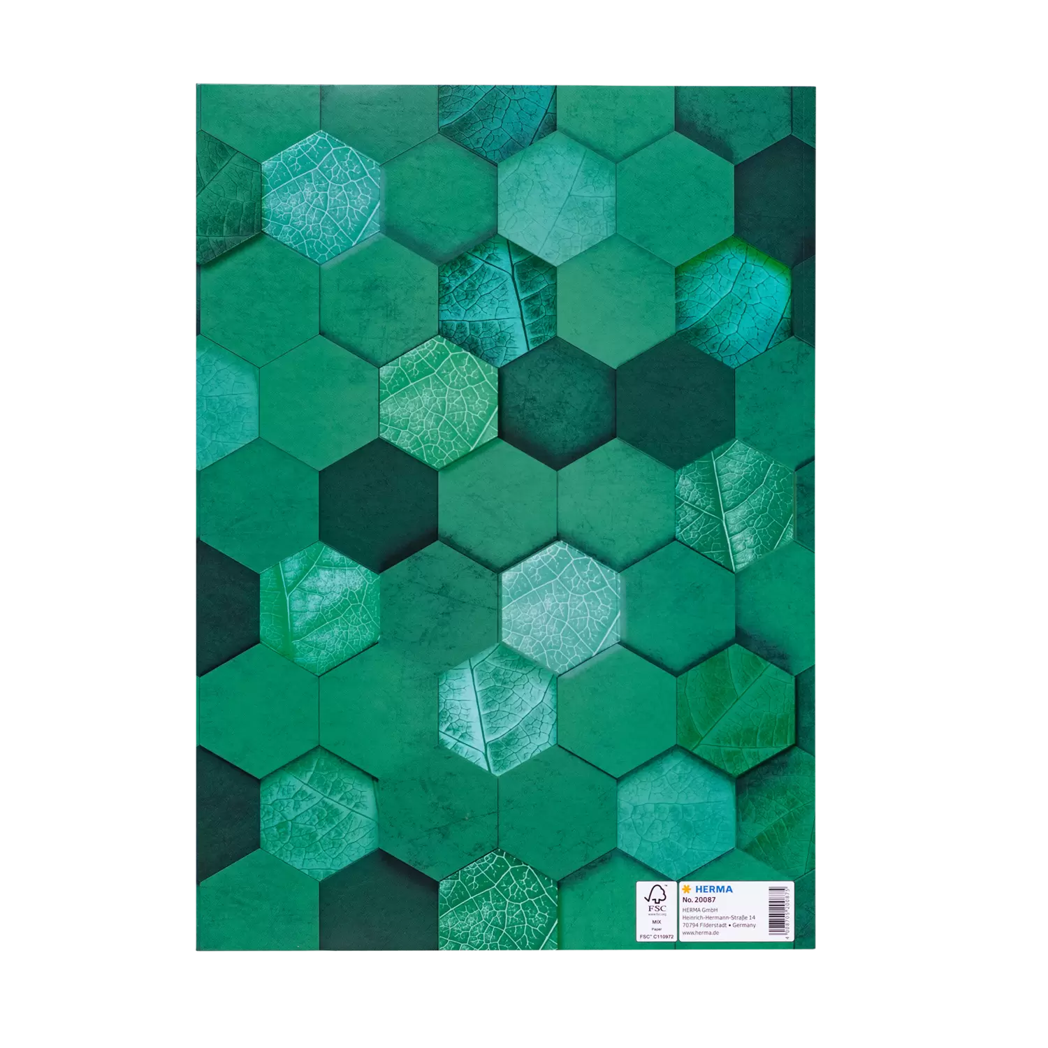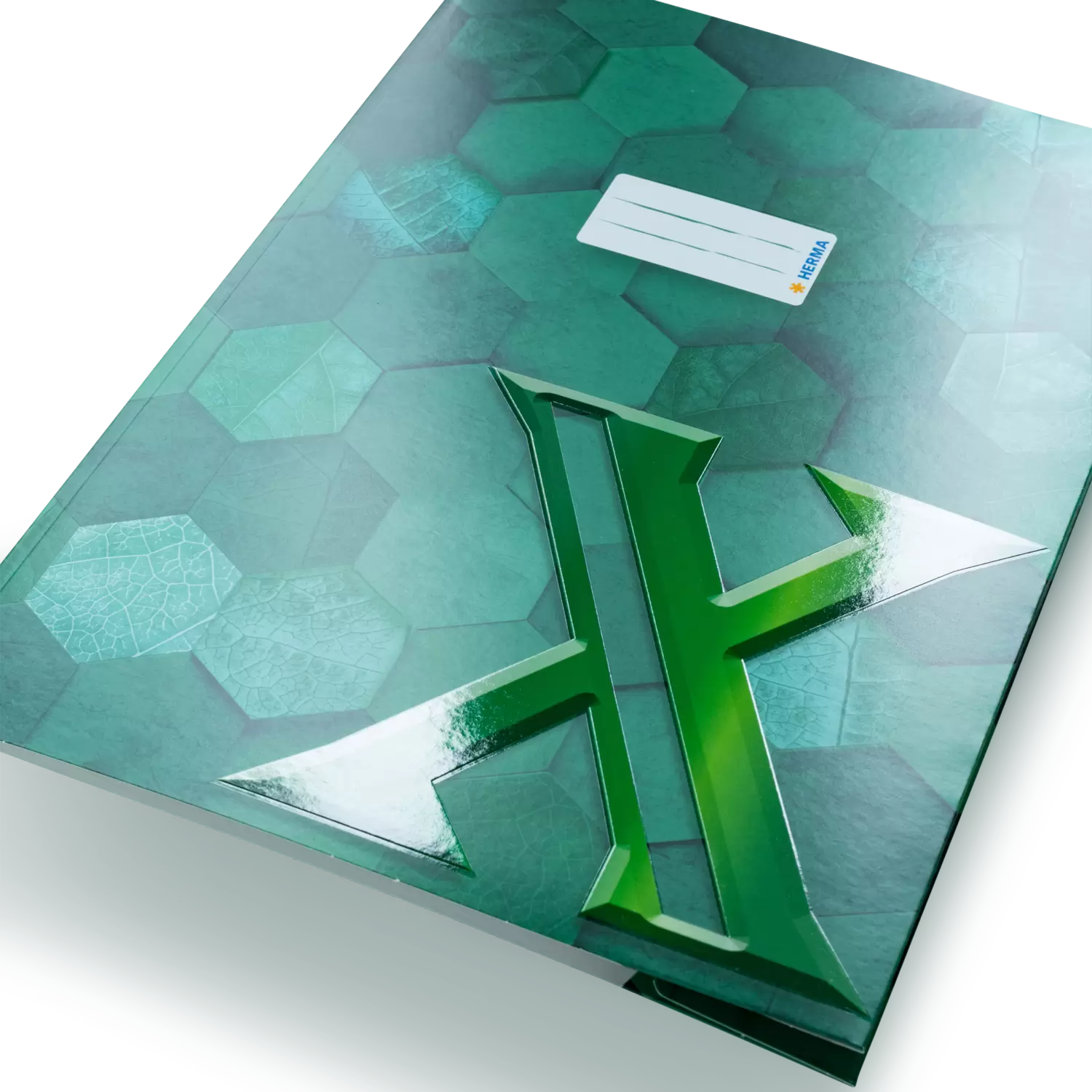 Le protège-cahier X de HERMA, en carton robuste, est unique et mystérieux. Le X lumineux et raffiné sur la face avant représente-t-il la variable mathématique, un code secret, l'élément créatif ou l'inconnue du contenu du cahier qui sera protégé ? Le protège-cahier de la série X n'est pas une simple jaquette, mais une porte vers un monde d'aventures et de mystères, mystique et varié. Ce protège-cahier vert foncé X est au format A4 et est décoré d'hexagones artistiques, ceux-ci sont remplis de fines structures de feuilles qui créent une structure organique fascinante. La vue de ce design cool avec le X lumineux et raffiné libère la créativité et permet de coucher les idées sur le papier. À l'école, pour étudier ou pendant les loisirs, ce protège-cahier est le compagnon idéal pour tous ceux qui recherchent l'originalité : la nouvelle série X.