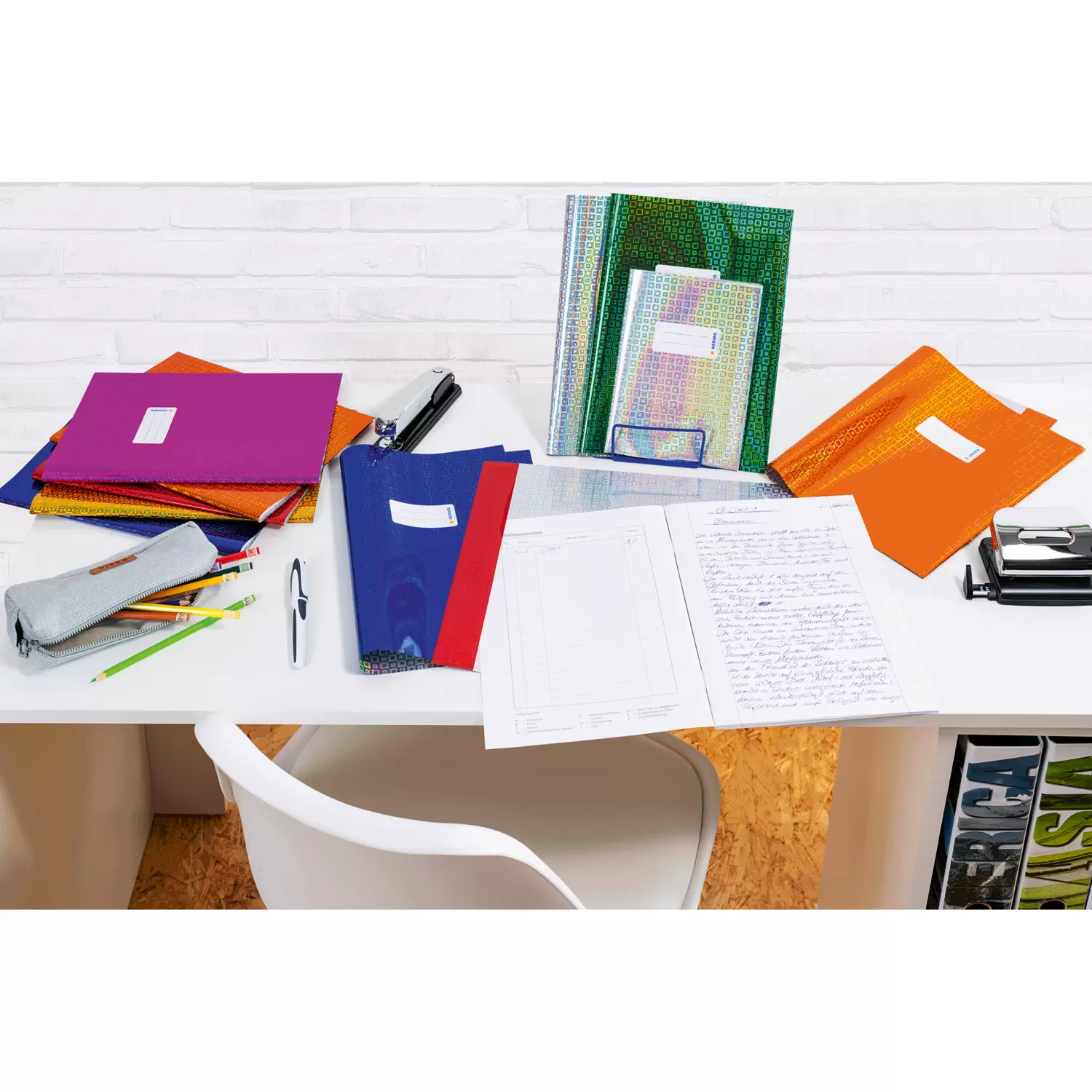 Ce protège-cahier raffiné est très particulier puisqu’il allie une grande fonctionnalité à un brin de magie. La protection pour cahier semble être simplement de couleur argent au premier coup d’œil. Mais quand la lumière luit sur le couvre-cahier, sa surface en film brillant holographique étincelle dans toutes les couleurs de l’arc-en-ciel. Cet effet met le fin motif en valeur. Si vous bougez légèrement le protège-cahier sous la lumière, vous constaterez des jeux de couleurs et de lumière et des effets changeants. La couverture pour cahiers est un véritable plaisir pour les yeux à l’école comme à l’université et attire tous les regards. Tous les documents, fiches de travail, cahiers de calcul, cahiers scolaires et cahiers d’écriture au format DIN A4 peuvent être placés dans ce protège-cahier qui les protège de la poussière, de la saleté et de l’usure. Le polypropylène est un matériau plastique extrêmement robuste et stable qui protègera les cahiers de manière fiable et durable. Il est possible d’inscrire des notes individuelles, comme le nom, la classe ou la matière sur l’étiquette de marquage très pratique figurant sur la face avant. Chacun peut ainsi voir du premier coup d’œil à qui le cahier appartient et ce qu’il contient. De plus, si le cahier a été égaré, il peut être ainsi rendu rapidement à son propriétaire.