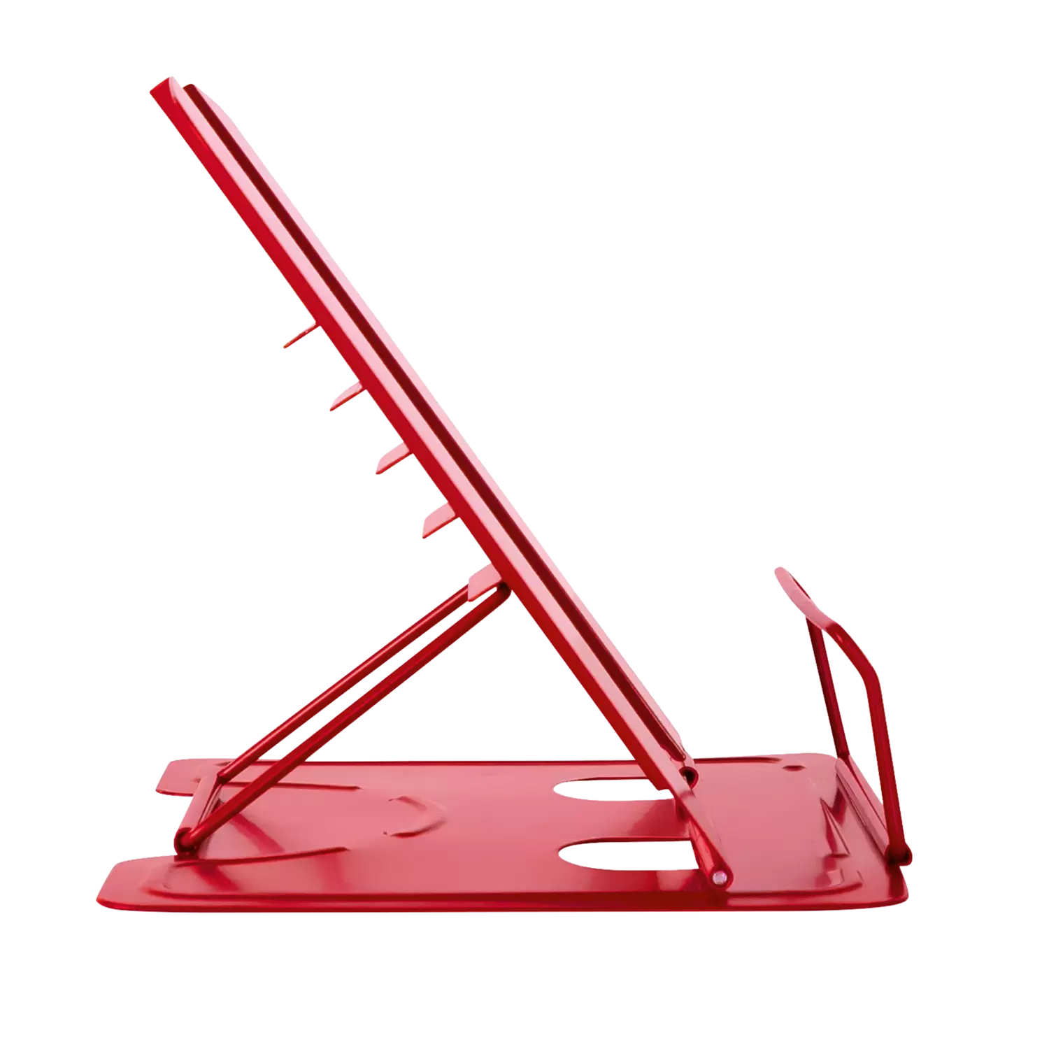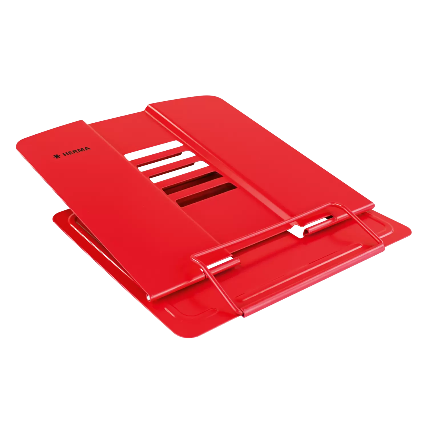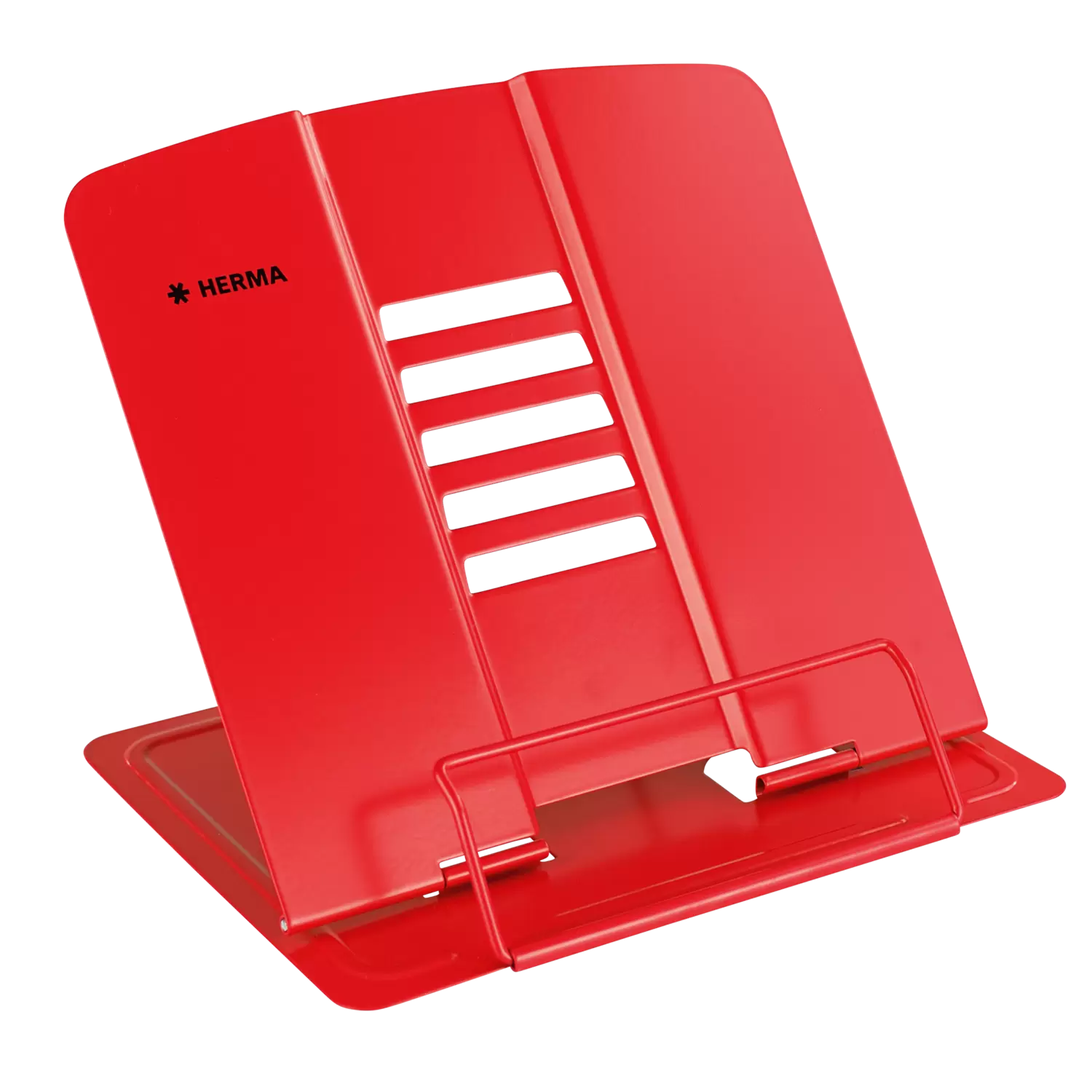 Pupitre de lecture, porte-livre, support de livre et de livre de cuisine, support de tablette : Il existe de nombreuses dénominations pour le support de livre unique et multifonctionnel de HERMA. Le pupitre de lecture est rouge, en métal laqué et une fois ouvert il fait19 cm de hauteur, 19,8 cm de largeur et 15,7 cm de profondeur. Il convient donc parfaitement pour les livres lourds, les atlas et les tablettes. L'inclinaison peut être réglée dans 5 positions différentes de manière à être confortable pour la nuque pendant l'utilisation sur le bureau, sur le campus ou dans la cuisine. Pour un maintien solide et optimal il dispose d'un dessous aux picots antidérapants. Il peut être plié et rangé facilement lorsqu'il n'est pas utilisé ou pendant le transport.Ce support de livre multifonctionnel est également disponible en bleu et en blanc. Il offre une stabilité et un maintien parfait pour entre autres des livres, des tablettes, des magazines, des cahiers, des livres de notes et de cuisine en tailles différentes. Il peut être utilisé de manière très flexible au bureau, au bureau à domicile, en voyage, à l'école, au campus, dans la maternelle, dans la cuisine, pour le barbecue à l'extérieur et chez soi sur le canapé.