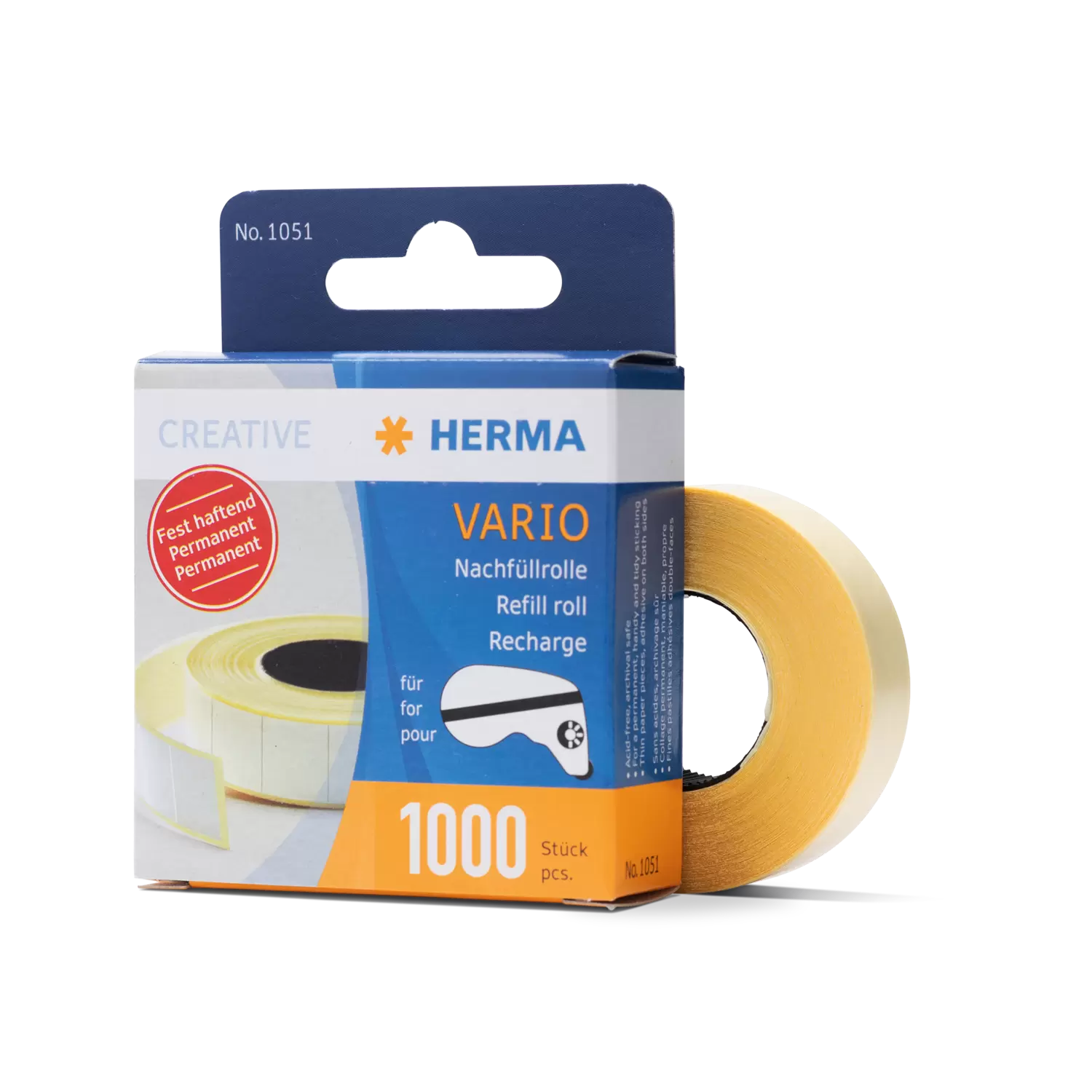 Avec le rouleau de recharge pratique de HERMA pour les distributeurs de ruban adhésif Vario à forte adhérence 1023 (bleu) et 1030 (noir), le distributeur est rapidement de nouveau prêt à l'emploi lorsque le rouleau est vide. Le distributeur s'ouvre facilement et le nouveau rouleau s'insère sans difficulté. Remplir et réutiliser au lieu de remplacer - c'est durable et respectueux de l'environnement.