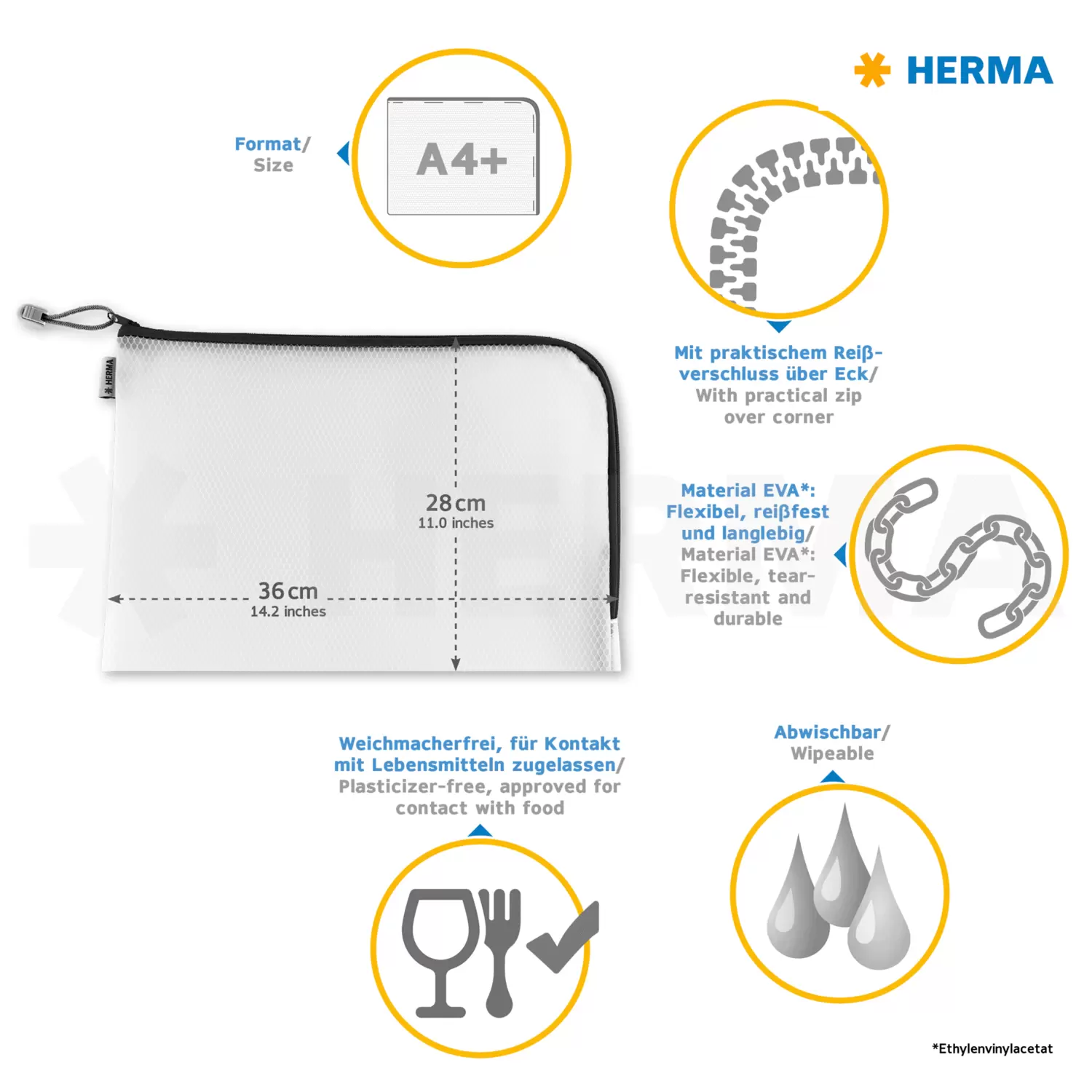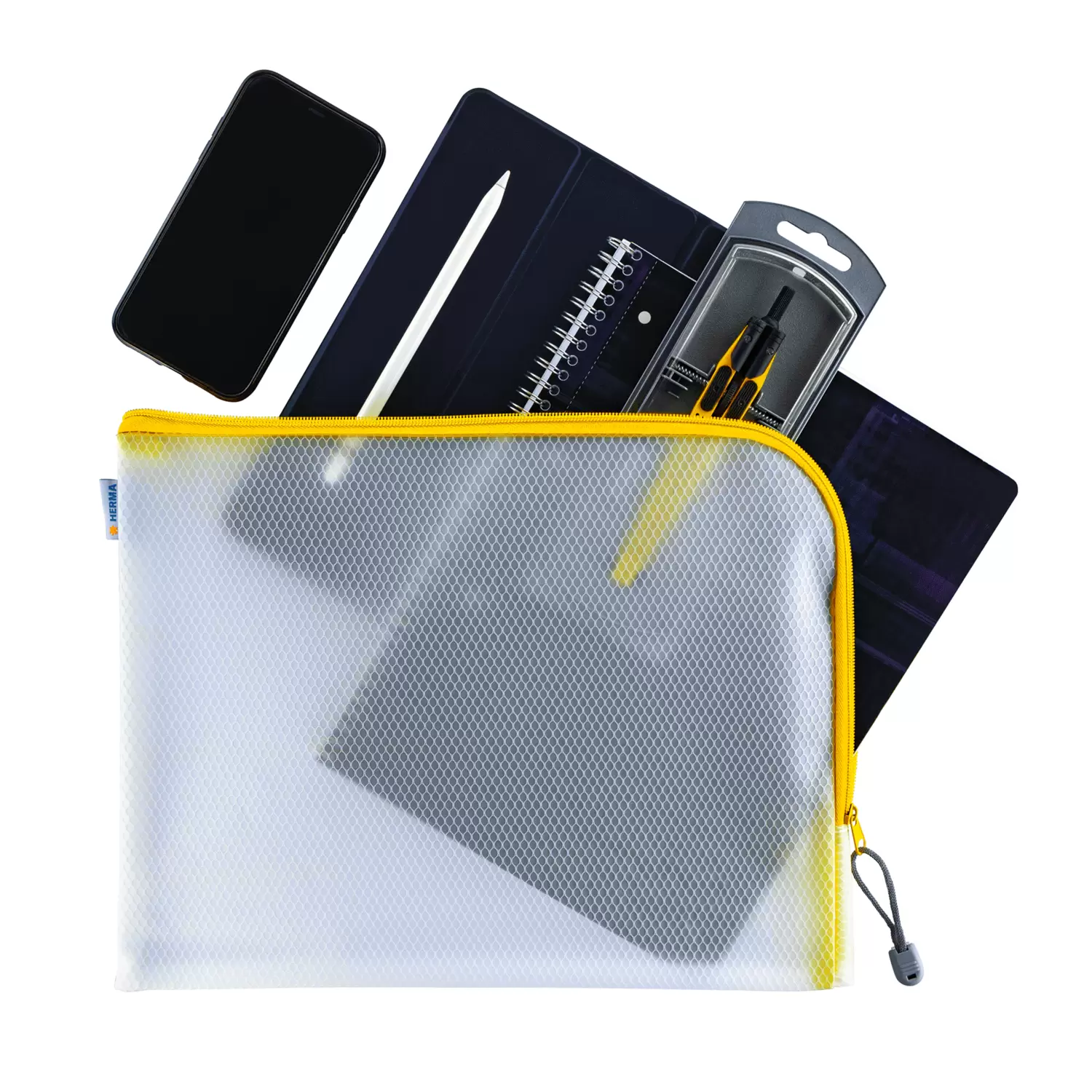 - Pochette universelle A4+ HERMA à fermeture zip pratique et coutures en jaune, 36 x 28 cm, matériau durable