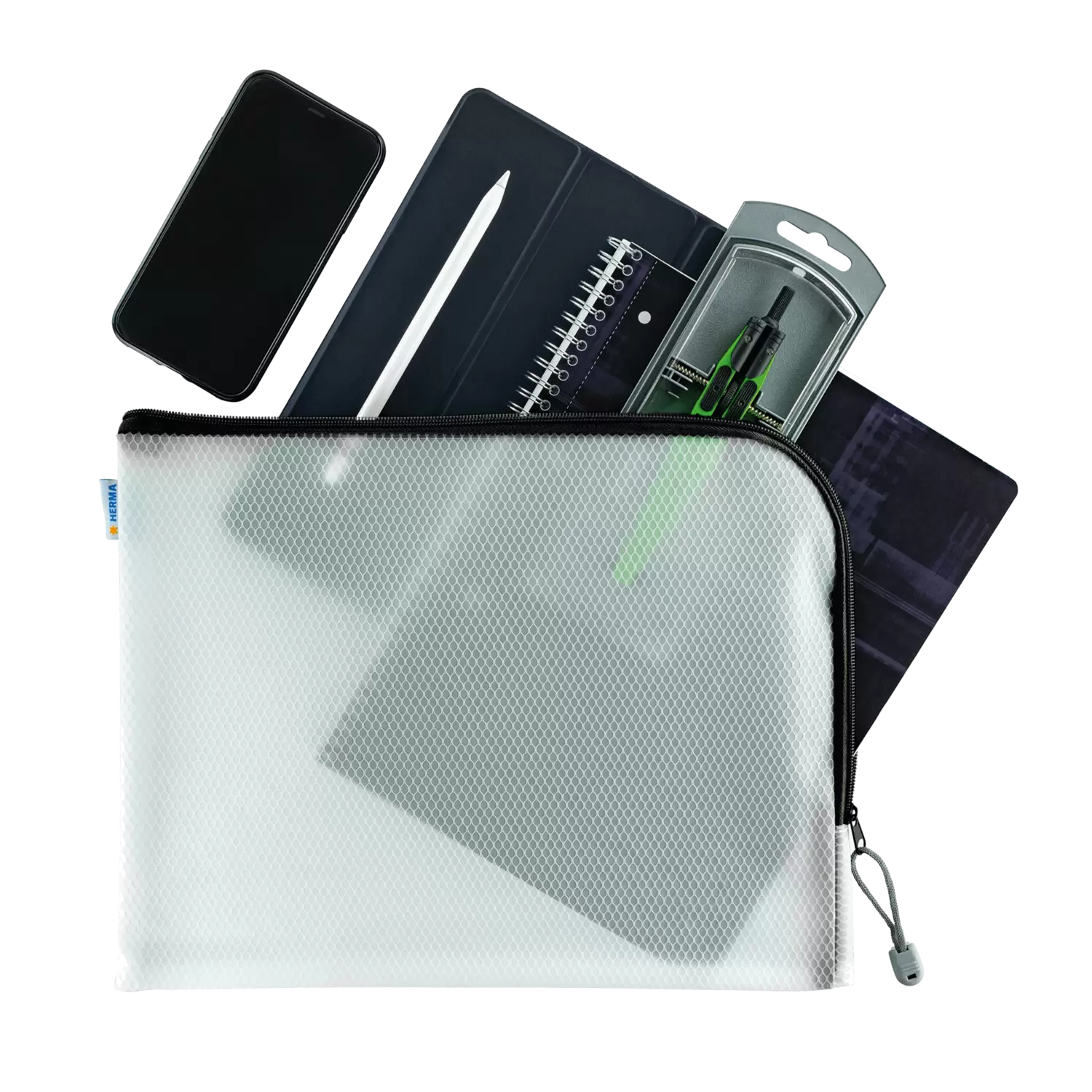 - Pochette universelle A4+ HERMA à fermeture zip pratique et coutures en noir, 36 x 28 cm, matériau durable