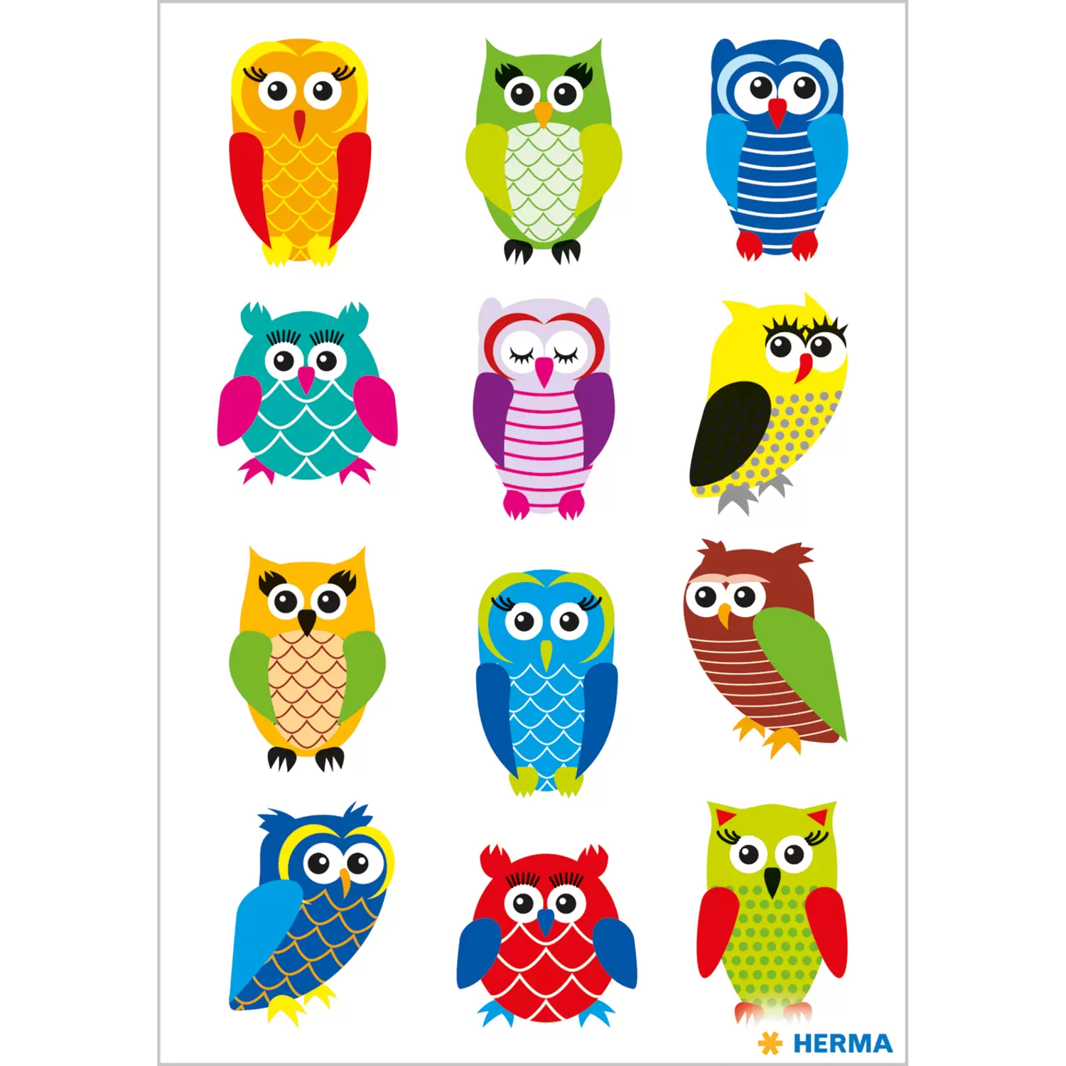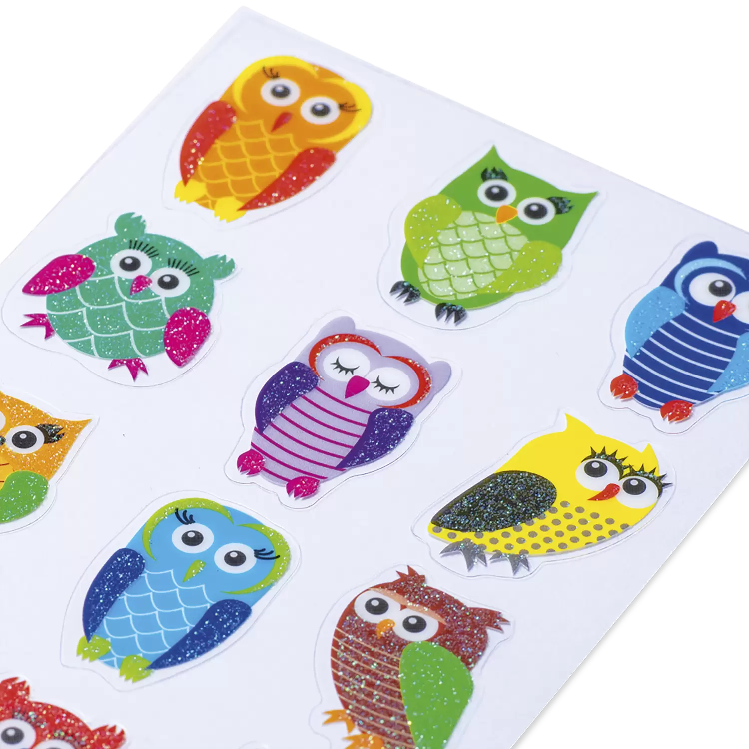 - Chouettes colorées, stickers adhésifs en film avec effet pailleté