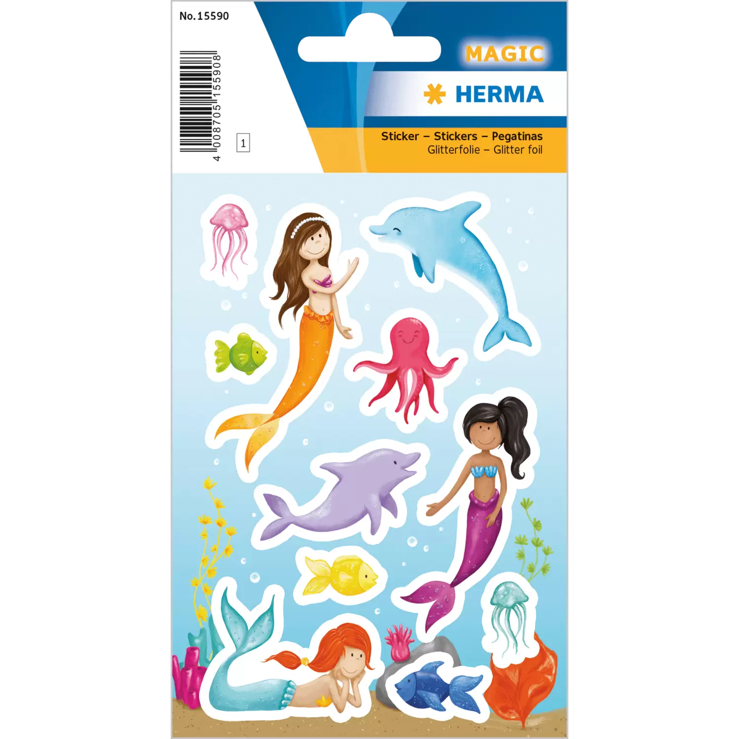 Pour toutes les fêtes sur le thème de la mer ou des sirènes: ces adorables autocollants de HERMA représentent trois sirènes différentes accompagnées de leurs meilleurs amis, les animaux marins. Dauphins, pieu vres et méduses sont les joyeux compagnons de la princesse des mers qui ne manqueront pas de mettre un sourire sur toutes les lèvres, en particulier des plus petits qui adorent laisser libre cours à leur créativité avec ces fabuleux autocollants. Pour cela, il suffit de décoller chaque sticker de son feuillet et de l’appliquer sur les différents supports choisis. Lettres, cartes, objets banals du quotidien ou cahiers et classeurs: tous peuvent recevoir une touche personnelle et individuelle grâce aux stickers Magic et ne plus être confondus avec aucun autre. Ces superbes étiquettes décoratives sont composées d’un film brillant de haute qualité, adhèrent de manière permanente et sont autocollantes. À l’école, au jardin d’enfants ou pour des loisirs créatifs entre amis, les enfants prennent particulièrement plaisir à utiliser ces autocollants aux allures marines. Même dans les albums photo des vacances, dans les cahiers de souvenirs ou les albums de collections, ces sirènes ou un de ces adorables animaux trouvent toujours une petite place pour attirer tous les regards.