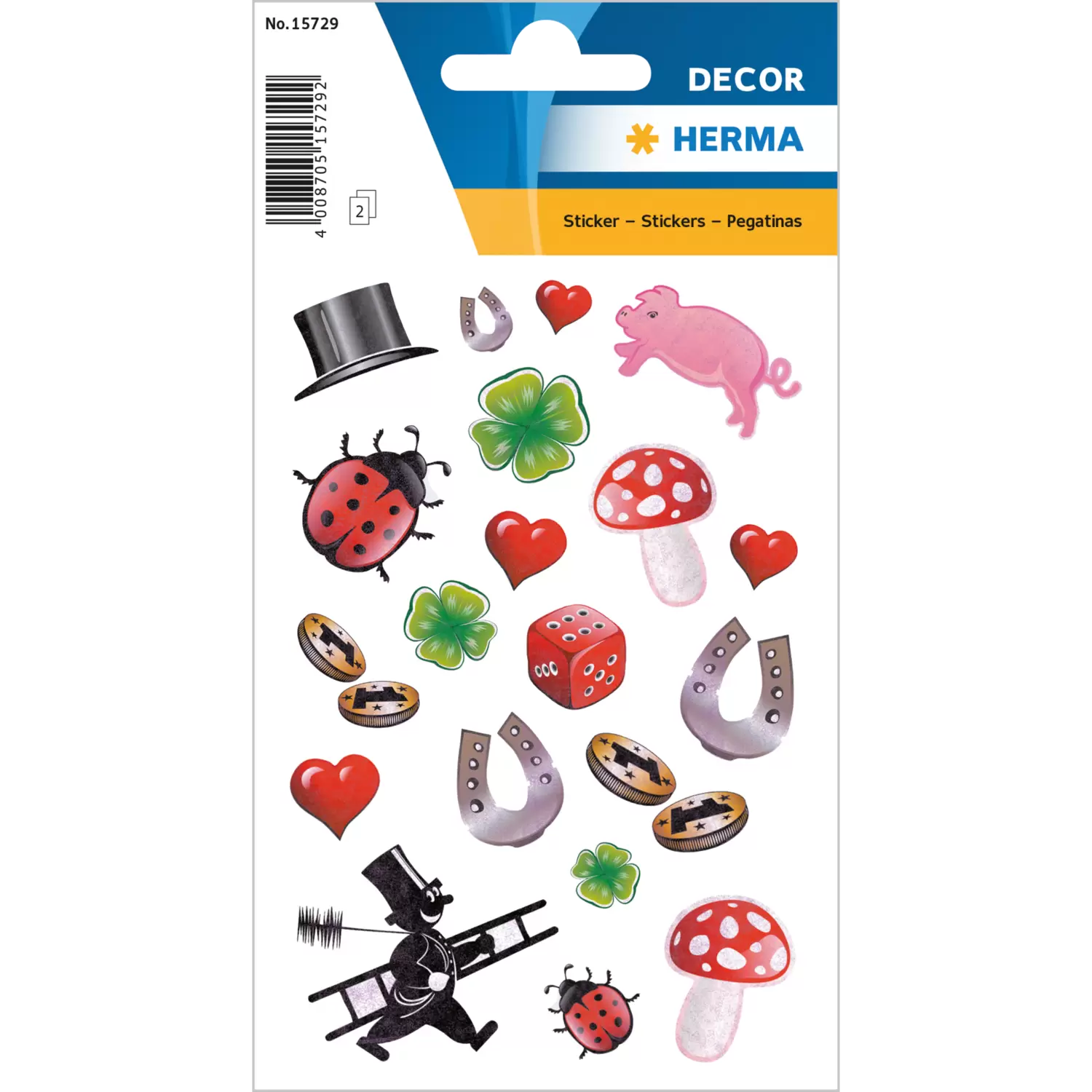 On ne peut jamais avoir trop de bonheur ! Les symboles porte-bonheur magnifiquement conçus sont parfaits pour décorer des cartes de vœux et des cadeaux, pour embellir des cahiers, des chemises et des classeurs, pour le bricolage ou pour collectionner et échanger. Parmi eux se trouvent le ramoneur, les fers à cheval, les centimes porte-bonheur, les trèfles et bien d'autres encore. Le clou du spectacle : les embellissements en paillettes fines - pour un grand effet scintillant ! Chaque paquet contient 2 feuilles de stickers avec 20 stickers chacune. Les stickers sont fabriqués d'un papier de haute qualité, sont auto-adhésifs et adhèrent de façon permanente à presque toutes les surfaces. Ils peuvent être facilement détachés et librement collés. Quelle chance !