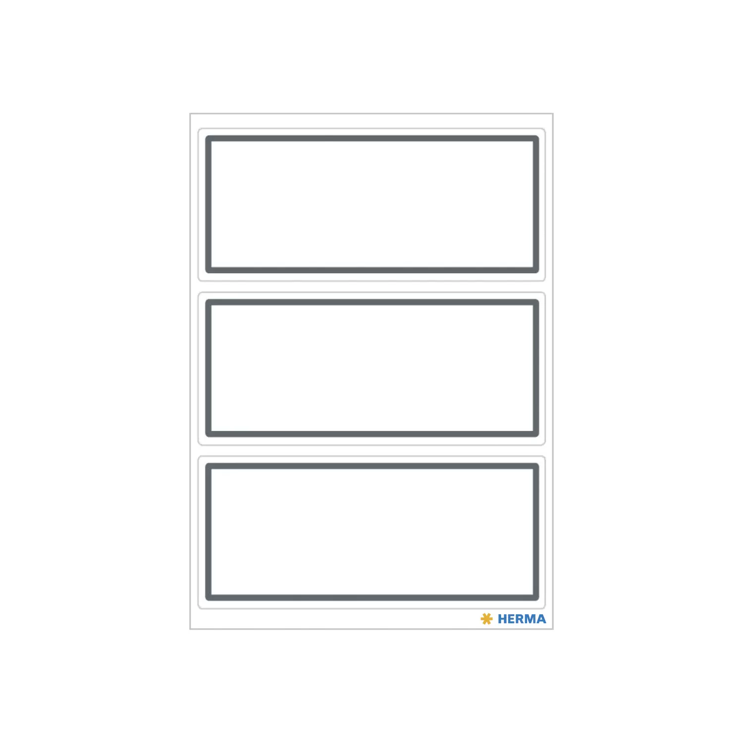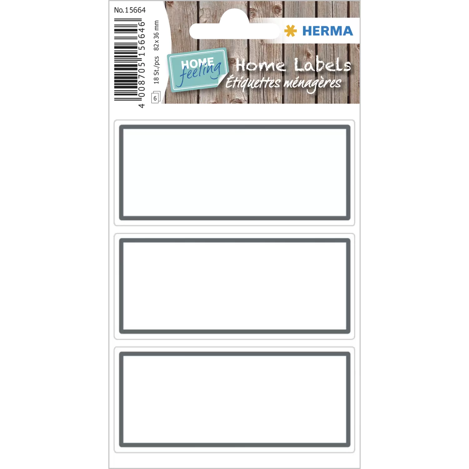 - Étiquettes ménagères blanches avec bordure grise, aux dimensions 82 x 36 mm, 18 étiquettes par pochette