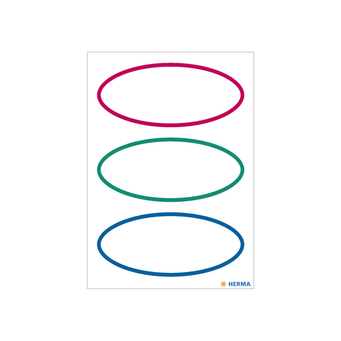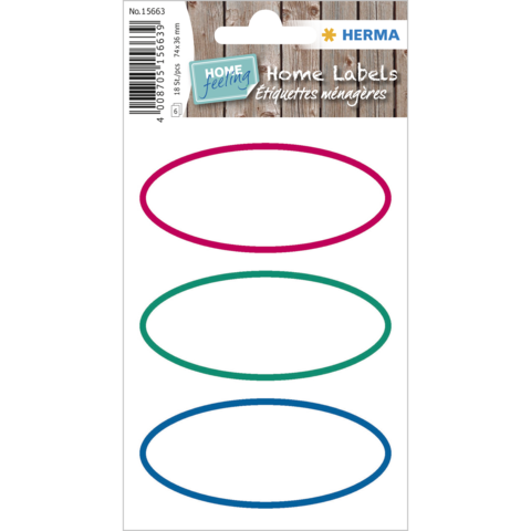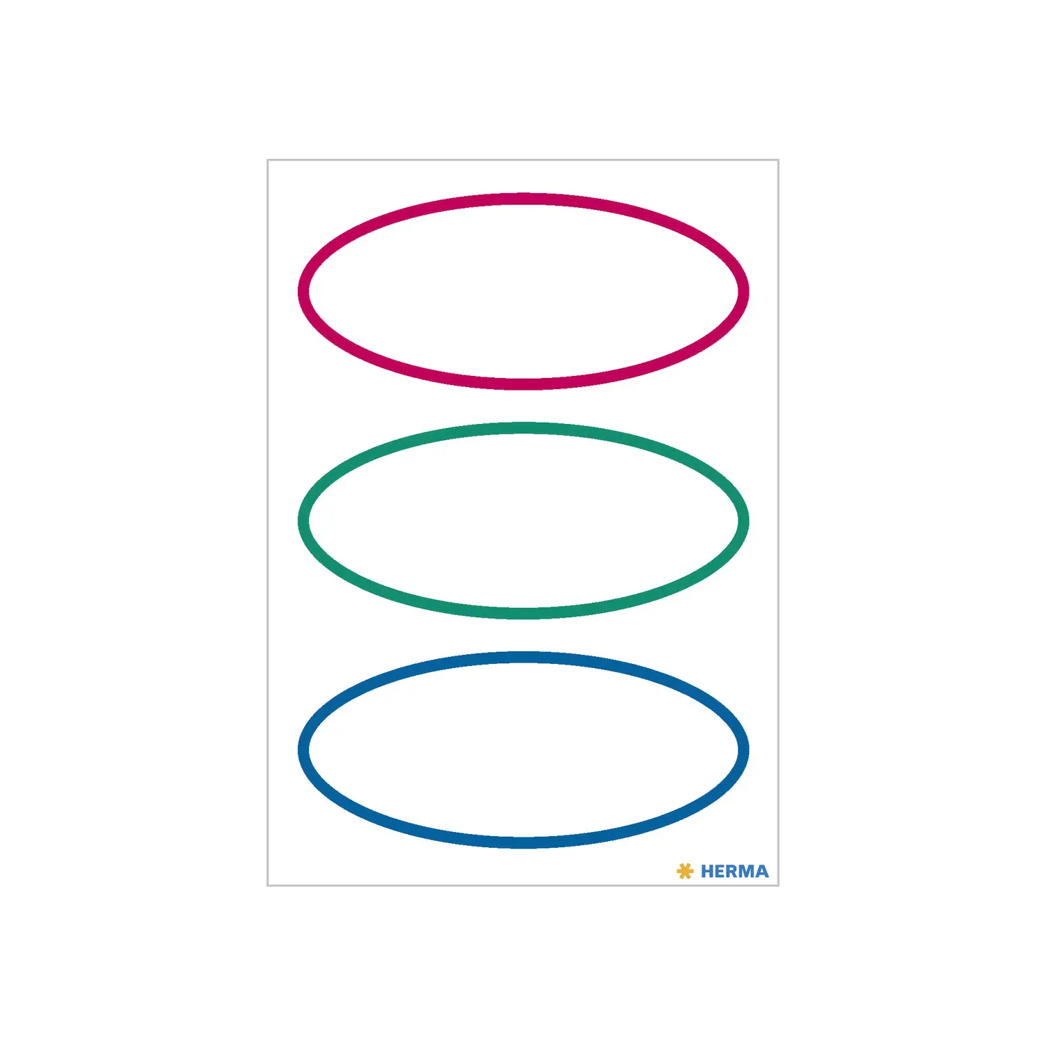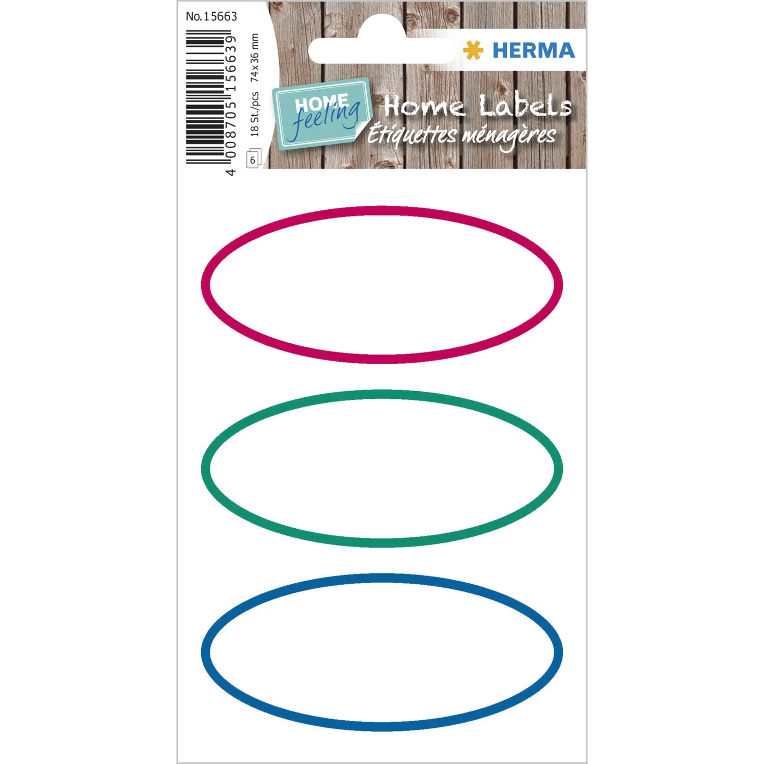 - Étiquettes ménagères ovales, blanches avec bordure colorée, aux dimensions 76 x 35 mm, 18 étiquettes par pochette