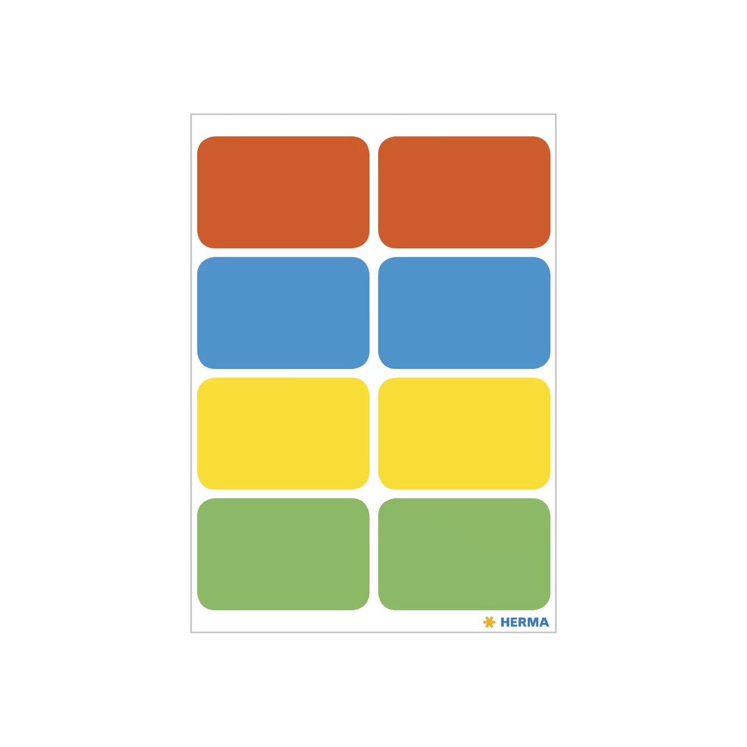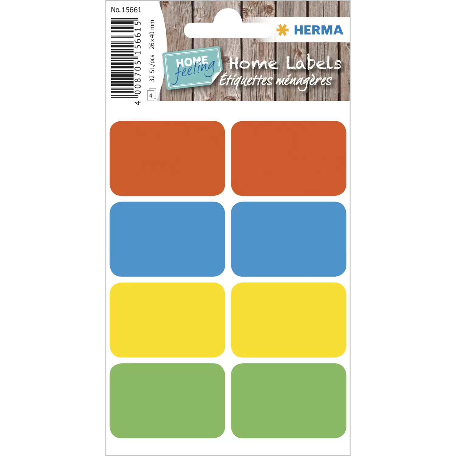 - Étiquettes ménagères de couleur rouge, bleue, jaune et verte, aux dimensions 26 x 40 mm, 32 étiquettes par pochette