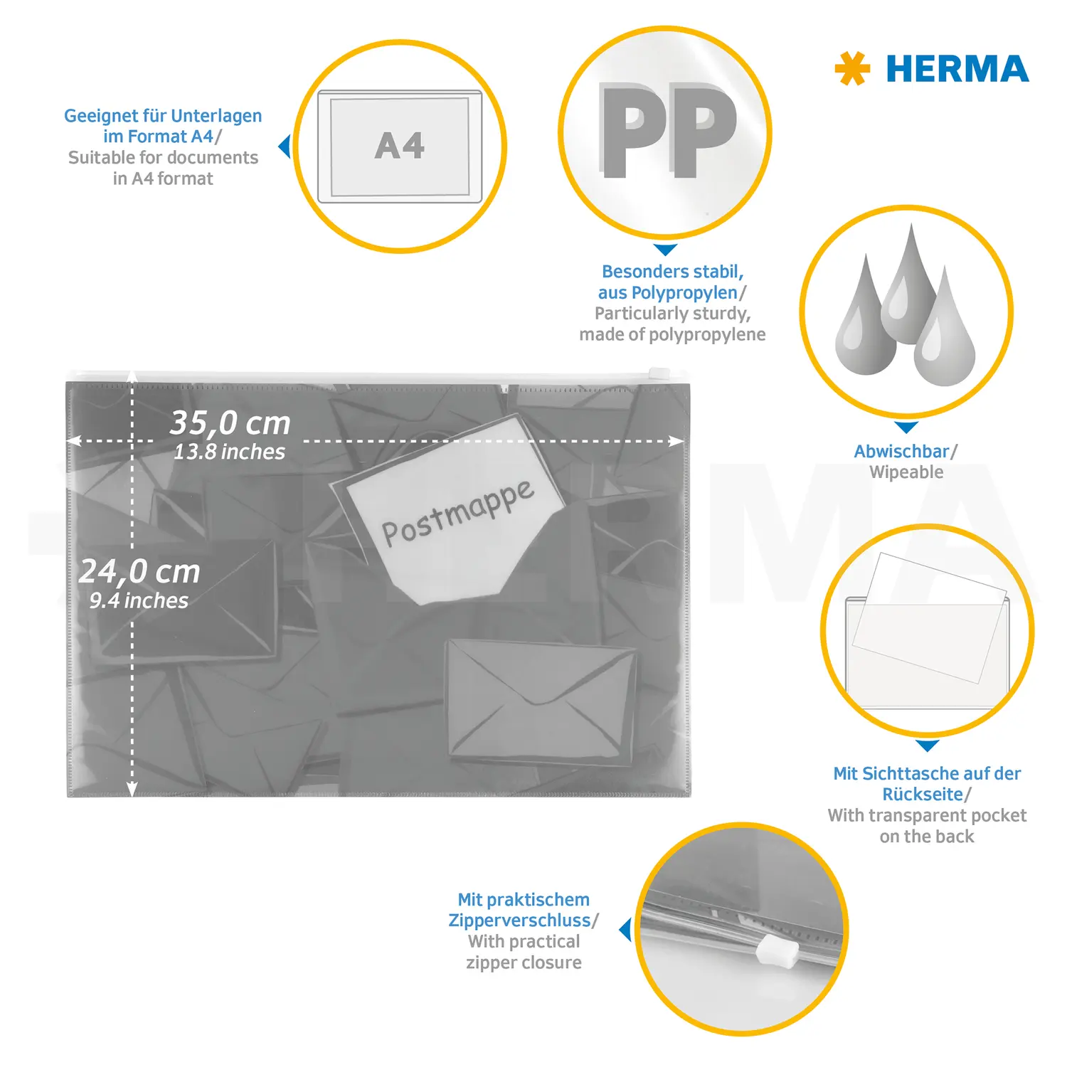 The HERMA mail folder with its practical zip fastener is ideal for storing and passing on documents and records, important papers and all documents that require special protection as well as for the exchange of information between teachers and parents. Everything important is protected from external factors such as dirt and moisture and the registrations for voluntary working groups, the money in the envelope for the class trip and invitations to the parents' evening are not lost. The zipper bag is suitable for stowing, storing, sending, packing, passing on and collecting documents, pictures, drawings and worksheets in kindergarten, school, household and office. The folder in the popular yellow HERMA mail folder design is made of 100% recyclable polypropylene (PP) and is therefore environmentally friendly, durable and robust. It has a size of 35 x 24 cm and is ideal for papers, A4 (punched) pockets, exercise books and books up to a format of A4+. The closure of the bag consists of a closure strip and a plastic slide, both free of metal and nickel, and glides easily along the upper longer edge of the folder. Thus the folder can be closed very easily and safely almost airtight and watertight and can also be opened again without any problems. On the back is the practical transparent insert pocket for a timetable, weekly planner or annual calendar.