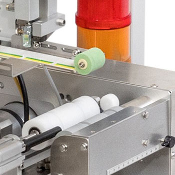 Les produits cylindriques et à forme stable sont mis en rotation dans un prisme de rouleau motorisé. L’étiquette est ensuite distribuée et appliquée avec précision par l’arête de décollage à pivotement pneumatique. |