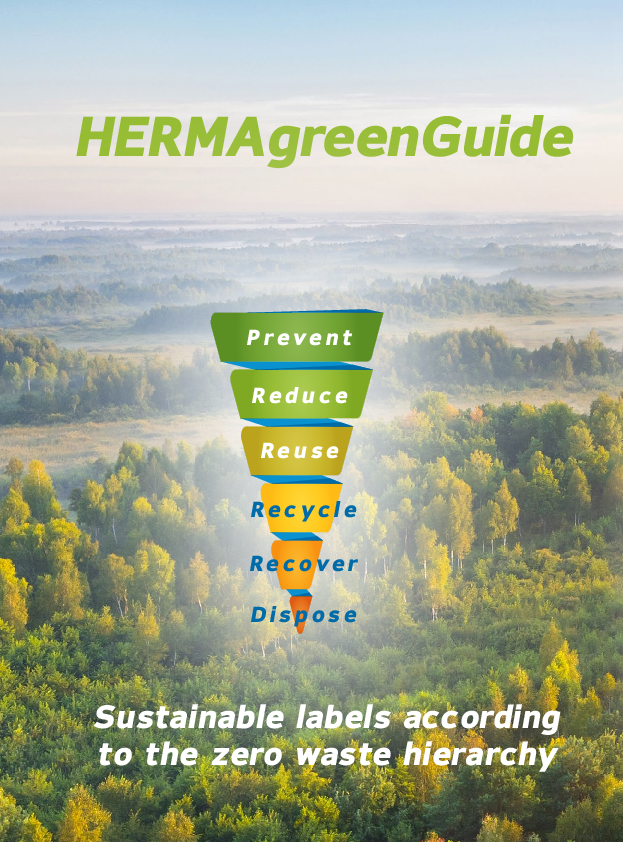Either the label is to be produced from low-impact materials (Reduce), to support the circular economy by way of its application and recyclability (Reuse or Recycle), or it is to be produced from compostable materials (Recover). For each of these four hierarchy levels, you will find your sample labels for the right HERMA material on the next pages.
